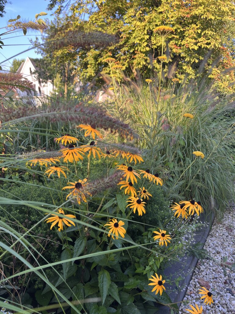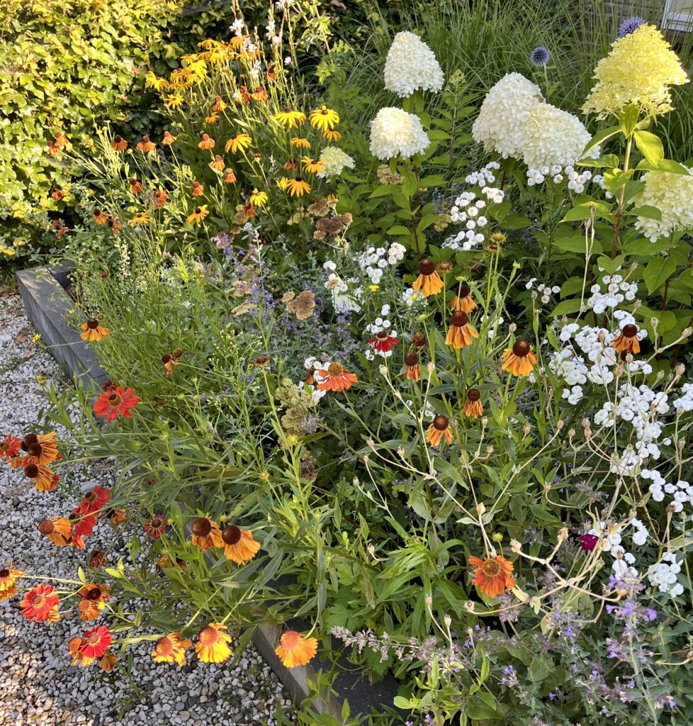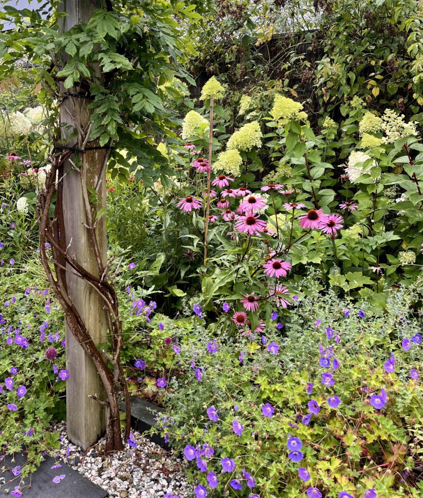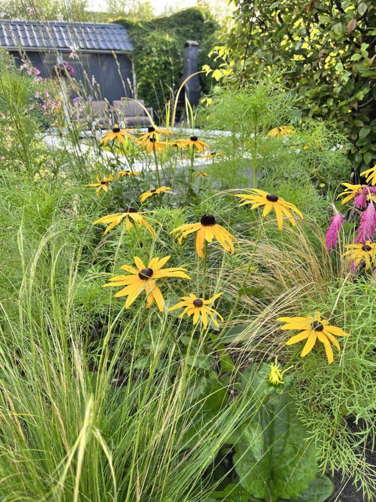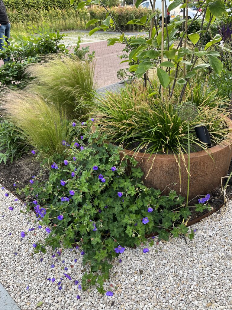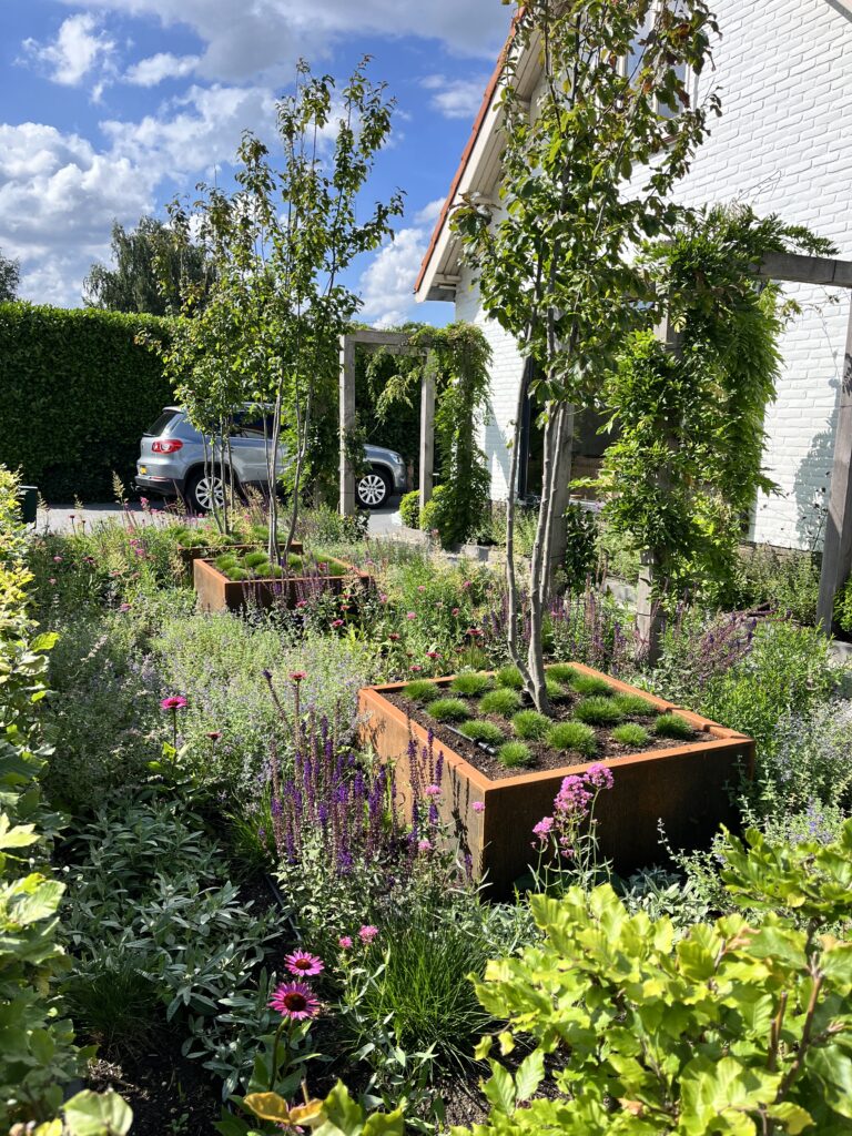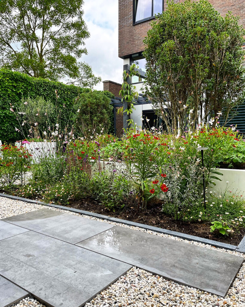Mijn tuinen zijn altijd groen, vol met planten en bomen. Een groene tuin is goed voor de biodiversiteit, verlaagt de temperatuur in de tuin, neemt Co2 op en verminderd stress. Tot rust komen in een groene oase na een drukke dag, of nog even wat bloemen plukken uit eigen tuin, is toch heerlijk. Of je nu een strak en modern ontwerp wilt of los en natuurlijk, in elke tuin is het mogelijk om groen toe te passen dat het ontwerp versterkt. Het is een misverstand dat een tuin veel onderhoud nodig heeft als er veel beplanting in staat. Als de borders eenmaal dicht zijn gegroeid, heeft onkruid nog maar weinig kans. Natuurlijk heeft de tuin wel onderhoud nodig, daar komt niemand onderuit. Maar door volle borders te creëren met een goed beplantingsplan, kun je dit wel sterk verminderen en meer relaxen in de tuin. Ik help je hier graag mee.